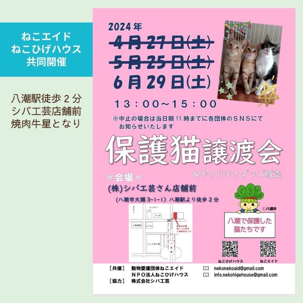 里親の申し込み、チャリティ販売、八潮市の野良猫相談などは受け付けております。