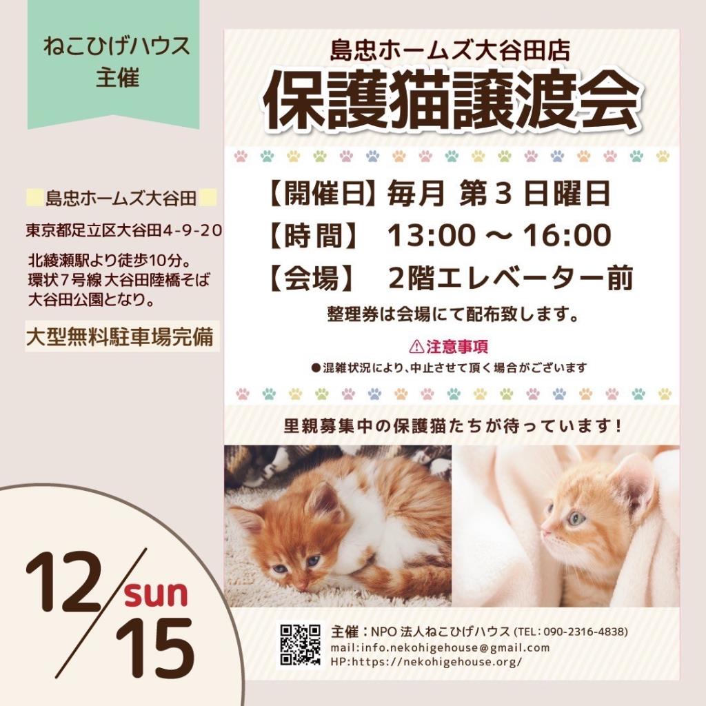 足立区島忠ホームズ大谷田店 子猫~シニア猫 (千代田線北綾瀬駅から徒歩10分)