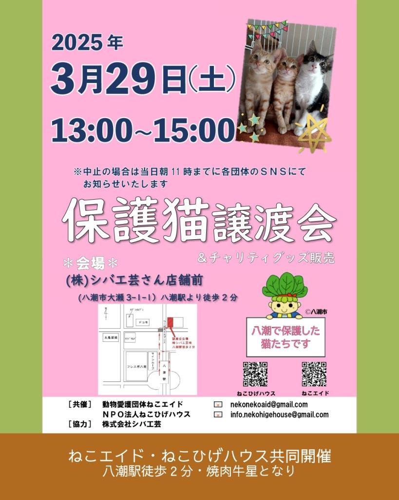 里親の申し込み、チャリティ販売、八潮市の野良猫相談などは受け付けております。