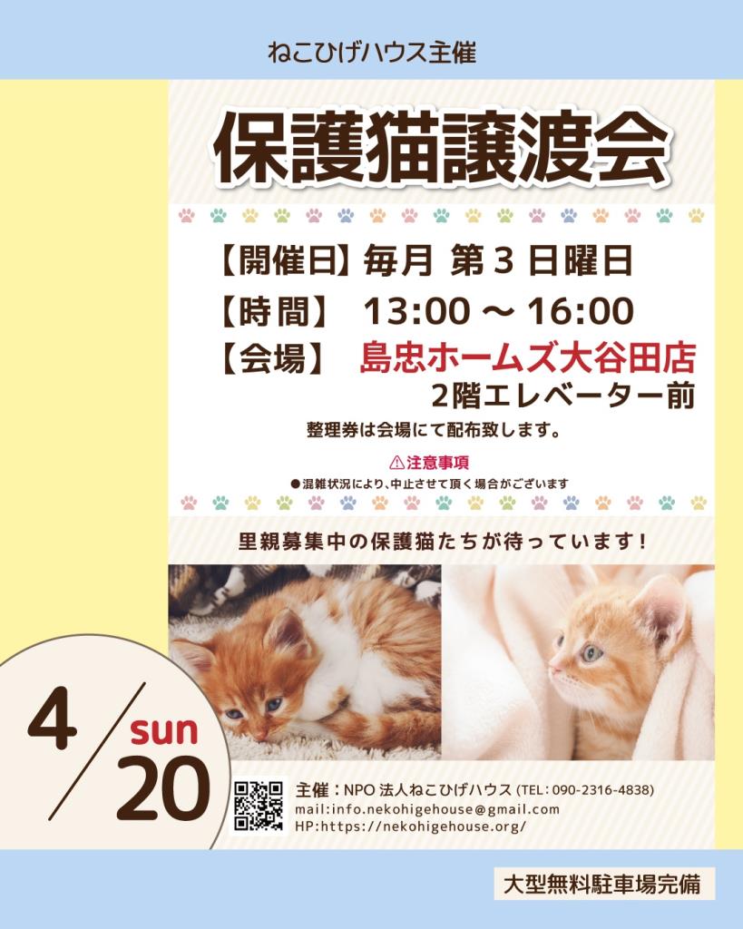 ねこひげハウスには現在約130頭の保護動物がいます。頭数は日々変化しております。そのうちの一部になってしまいますが、島忠ホームズ大谷田店さんにて譲渡会に参加させていただきます。