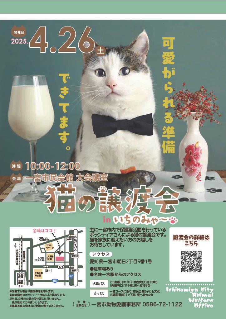 一宮市に登録のある猫の譲渡ボランティアによる譲渡会です。猫の里親になりたい方、お気軽に来てみてください。予約不要です。