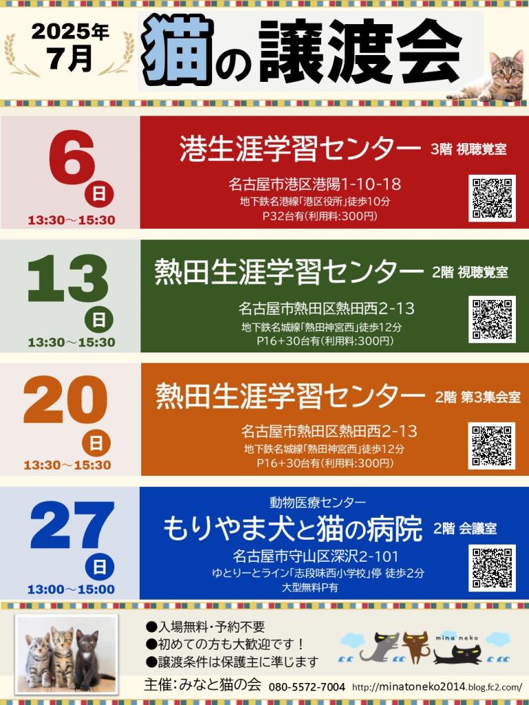 7月20日(日) 名古屋市熱田区 熱田生涯学習センター 猫の譲渡会