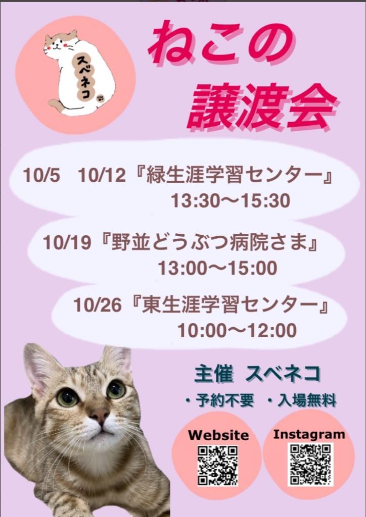 10月5日(日)緑生涯学習センターにて開催!猫の譲渡会 byスベネコ