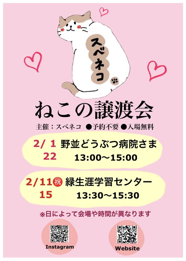 2月22日(日)スベネコ 猫の譲渡会 @野並どうぶつ病院(名古屋市天白区)