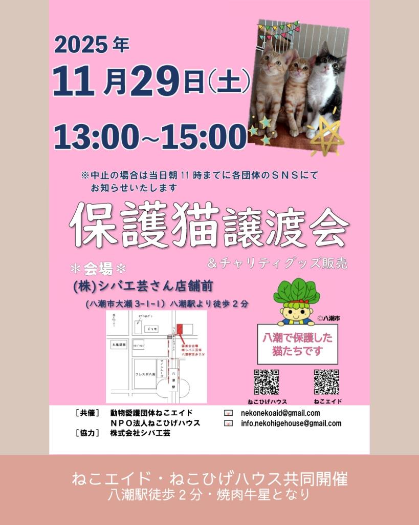 里親の申し込み、チャリティ販売、八潮市の野良猫相談などは受け付けております。
