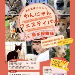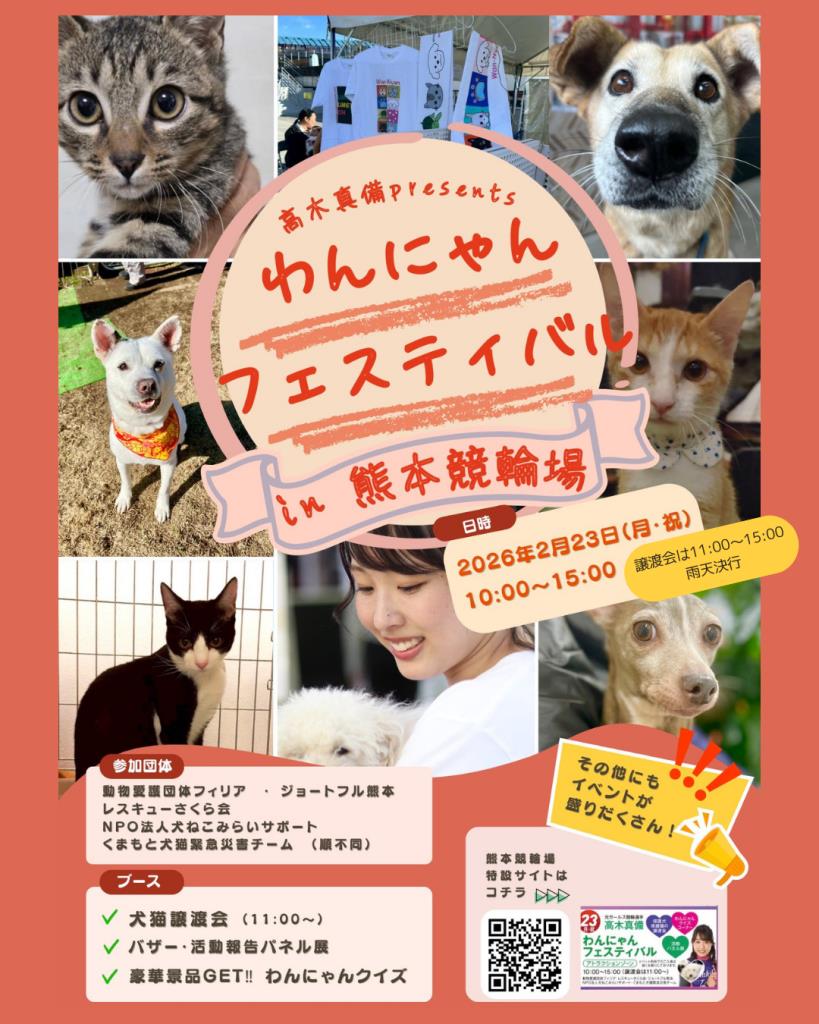 リニューアルされた熊本競輪場で開催されるビッグレース全日本選抜競輪G1にあわせ、元 競輪選手の高木 真備さんによる動物愛護イベント「わんにゃんフェスティバル」内で譲渡会を開催します。