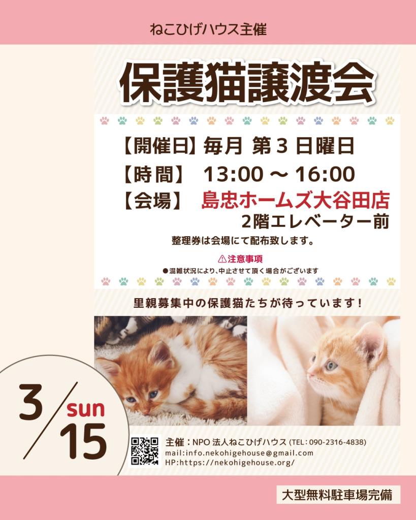 ねこひげハウスには現在約130頭の保護動物がいます。頭数は日々変化しております。そのうちの一部になってしまいますが、島忠ホームズ大谷田店さんにて譲渡会に参加させていただきます。