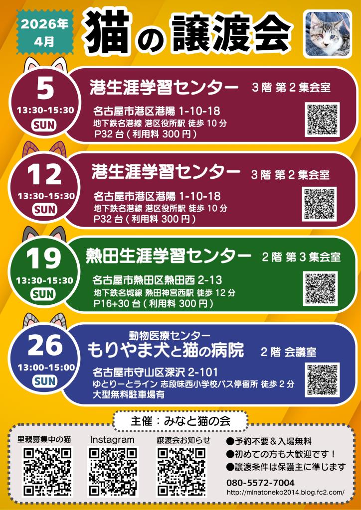 4月5日(日)名古屋市港区 港生涯学習センター 猫の譲渡会