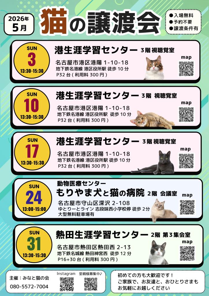 5月17日(日)名古屋市港区 港生涯学習センター 猫の譲渡会