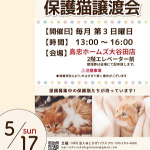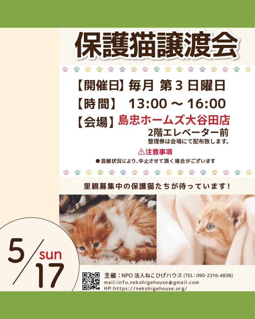 ねこひげハウスには現在約130頭の保護動物がいます。頭数は日々変化しております。そのうちの一部になってしまいますが、島忠ホームズ大谷田店さんにて譲渡会に参加させていただきます。