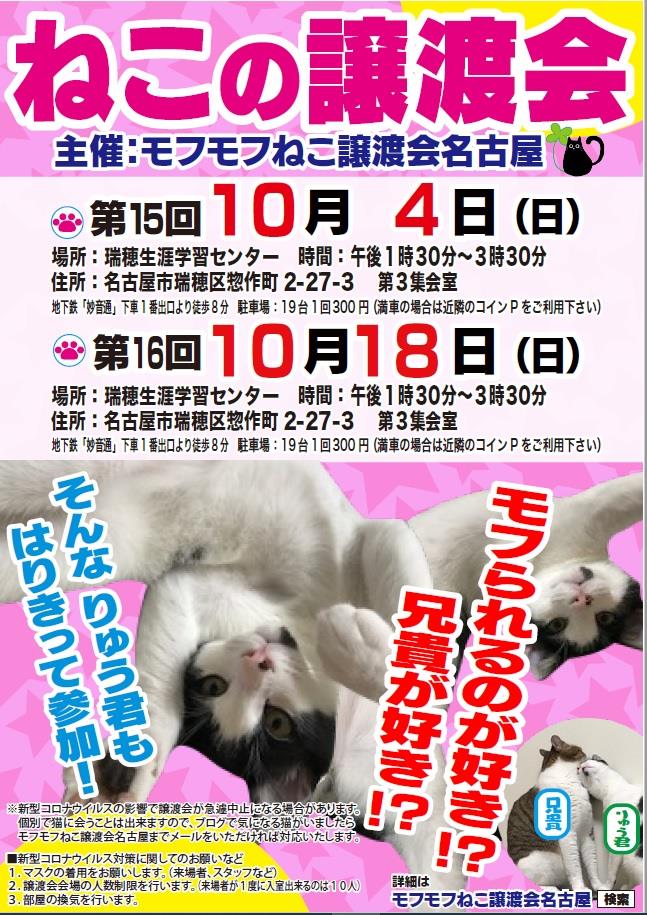 ・新型コロナウイルスの影響により急遽中止になる場合もありますので、モフモフねこ譲渡会名古屋ブログにてご確認の上、ご来場ください。