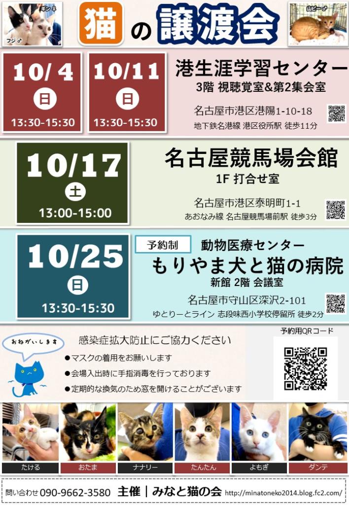 10月11日(日) 名古屋市港区 港生涯学習センター 猫の譲渡会