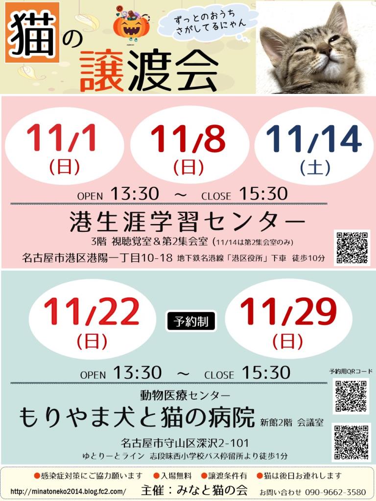 11月8日(日) 名古屋市港区 港生涯学習センター 猫の譲渡会