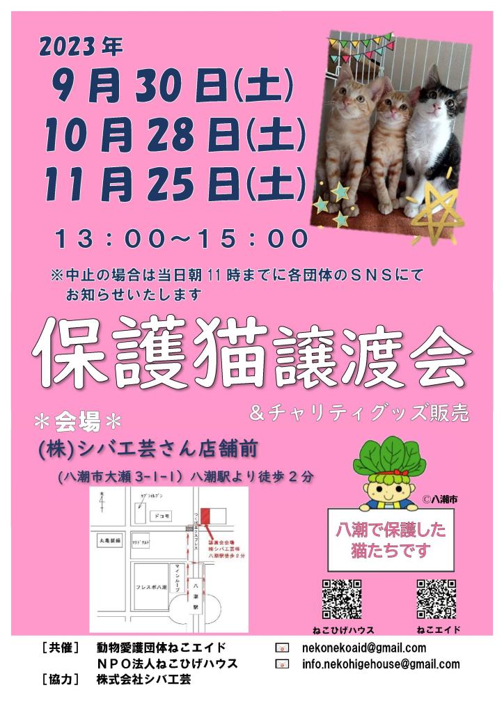 里親の申し込み、チャリティ販売、八潮市の野良猫相談などは受け付けております。