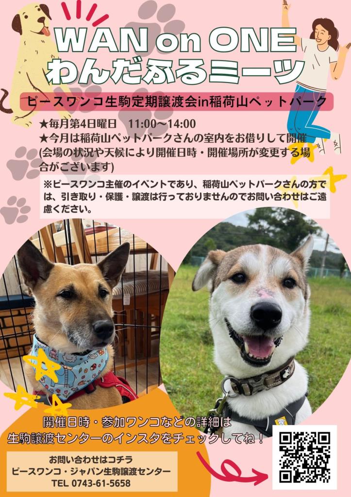 稲荷山ペットパークにて譲渡会「WAN on ONE わんだふるミーツ」を開催します。