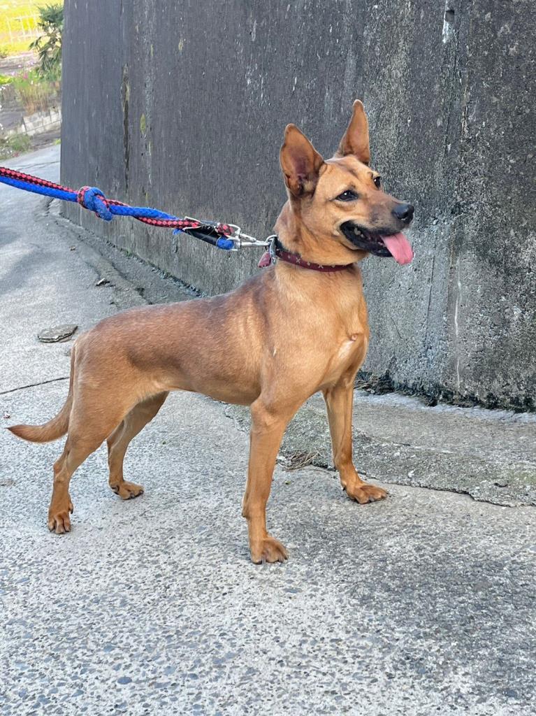 こんがりとした焦げ茶色の毛色に大きな瞳が強調された美犬さんです。