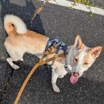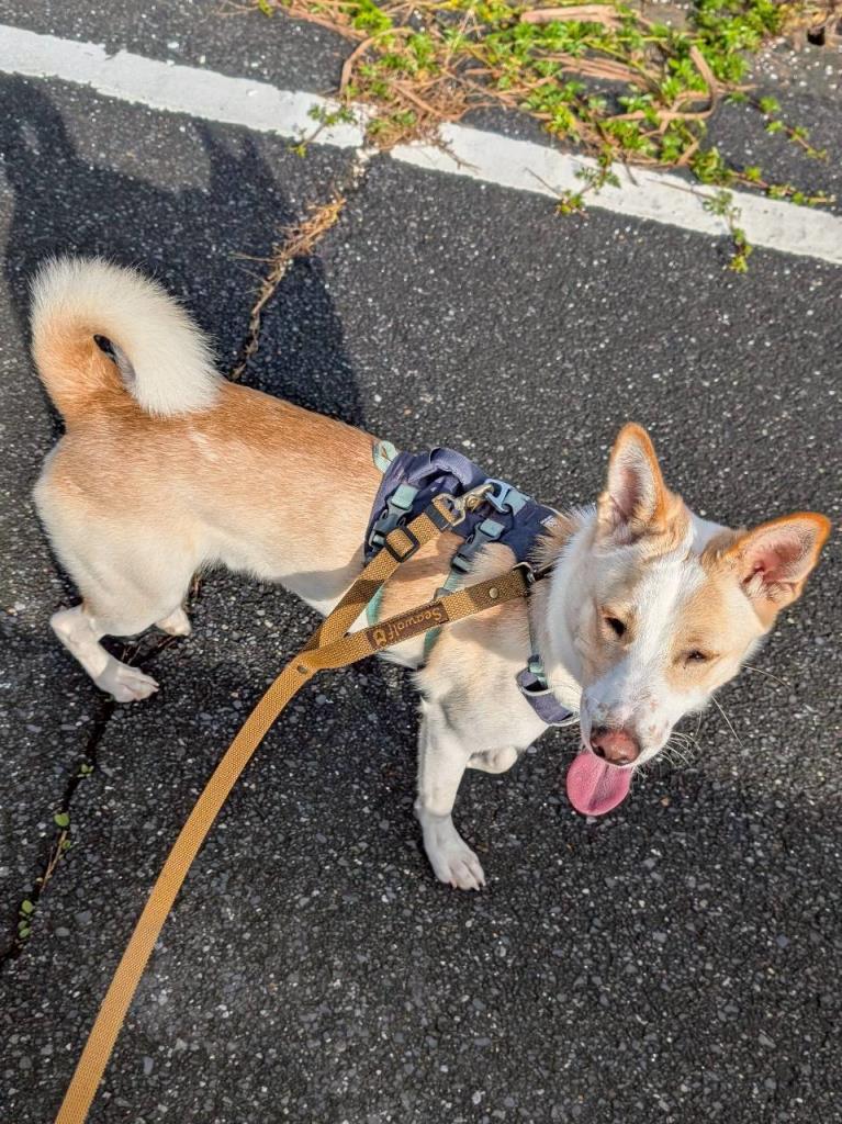 お散歩は好きですが、大きい車、すれ違う人と自転車に警戒して怖がり、逃げようとしたりするので、止まっておすわりをしてやり過ごします。