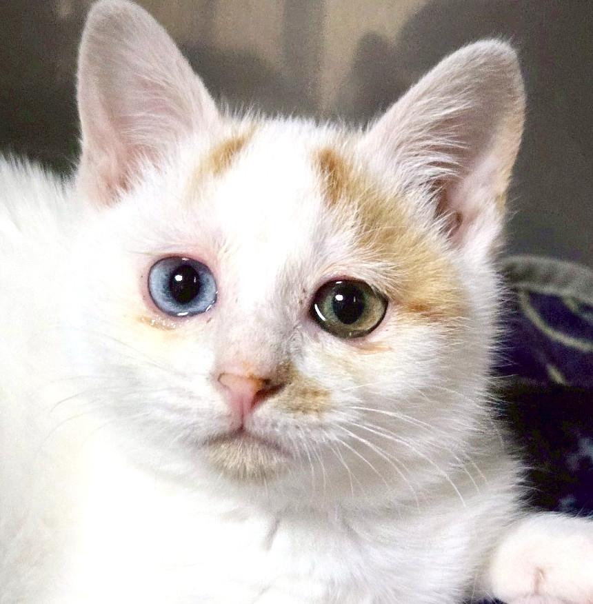 用水路で鳴いていた所を保護してもらい、幸せになって欲しいと休憩所に入居になりました🥰チャームポイントはきれいなオッドアイと、困り顔に見えるおでこの模様💛活発で天真爛漫なスリゴロガールです☺抱っこも好きです💛