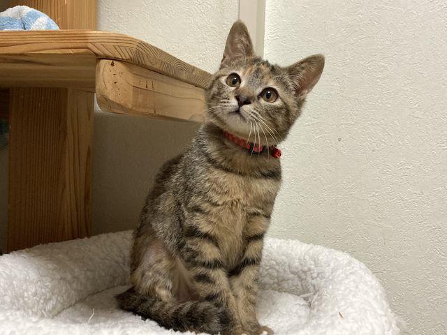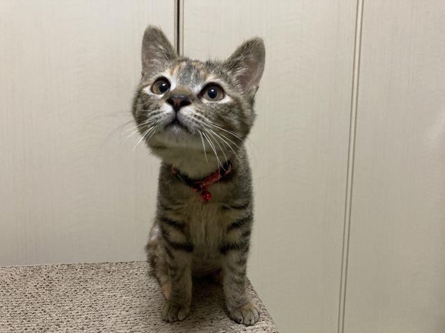 目と口の周りが白くて愛らしい、キジの女の子です。