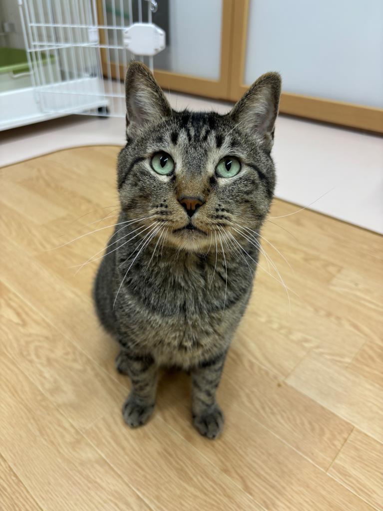 収容時は攻撃的な性格で、パンチを繰り出していました(-_-;)。今はだいぶ落ち着きましたが、まだ正面から触られるのは苦手です。そんなナナフシくんペースで寄り添ってくれる飼主さん募集中です。
