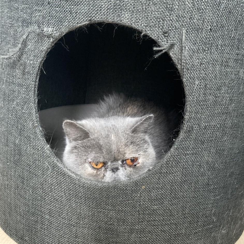 警戒心が強く犬猫には強気ですが、今は特定の子にだけ反応します。人は好きで甘えてきます。ご飯はまとめず、頻回で食べています。