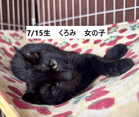 ハチワレのママ猫が4匹の子猫を連れてきました ラグドール風2匹 黒猫2匹 オスメス2匹ずつです くろみはよく食べよく遊ぶ艶々毛並みです 性格は控えめで繊細な女の子です 保護してすぐは怖がっていましたが慣れてきてケージに入れるときなどすぐにつかまるようになりました  人間に時々ゴロゴロ言います 子猫とも大人猫とも仲良くできます