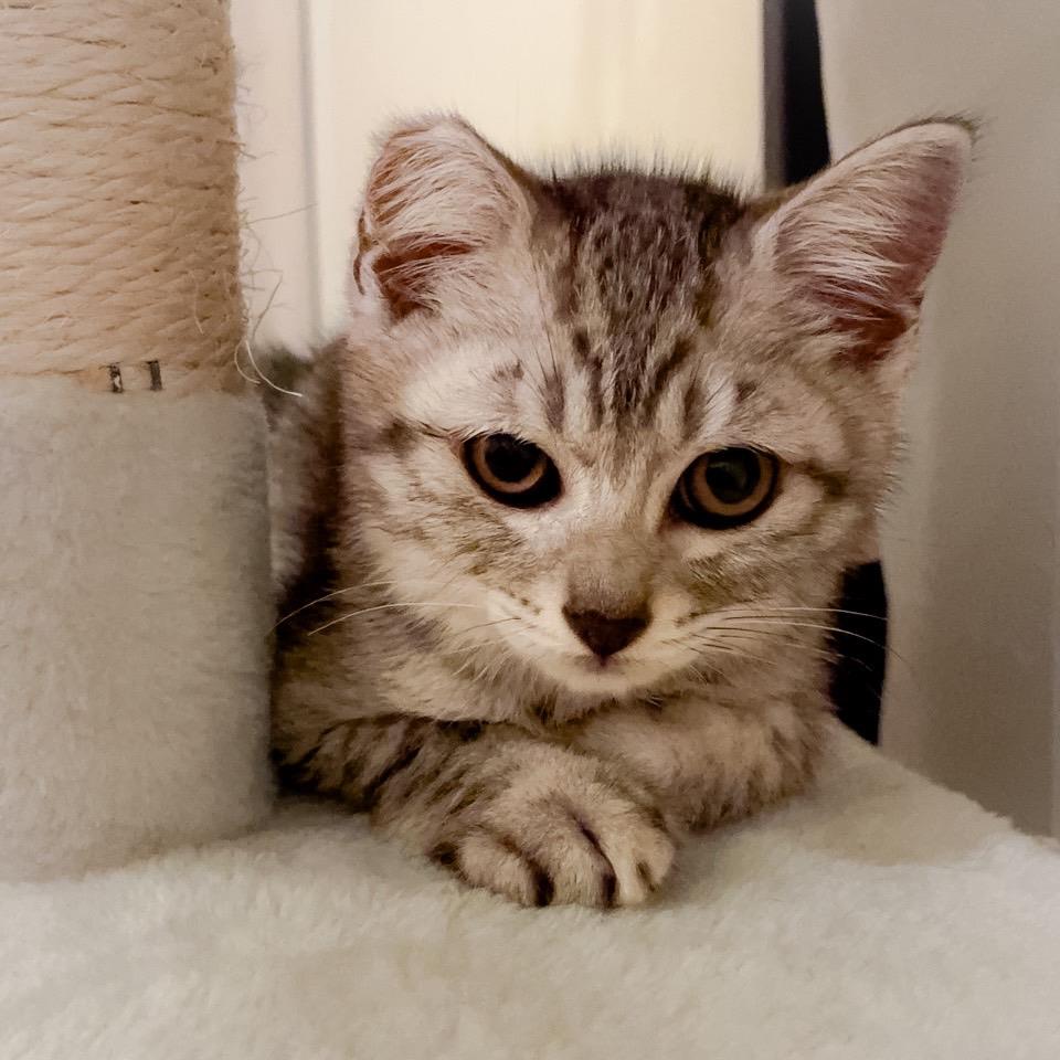 右耳の先は、カラスにつつかれたために欠けた部分があります。最初は少し遠慮がちですが、着実に人とのコミュニケーションに慣れようと努力中です。彼は猫が大好きなので、先住猫がいるお家でも安心して迎えられます。