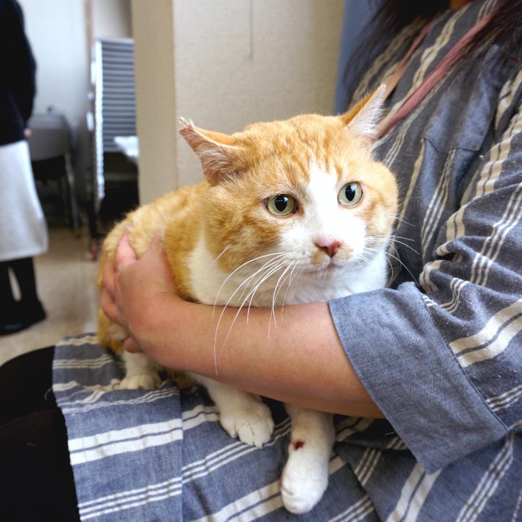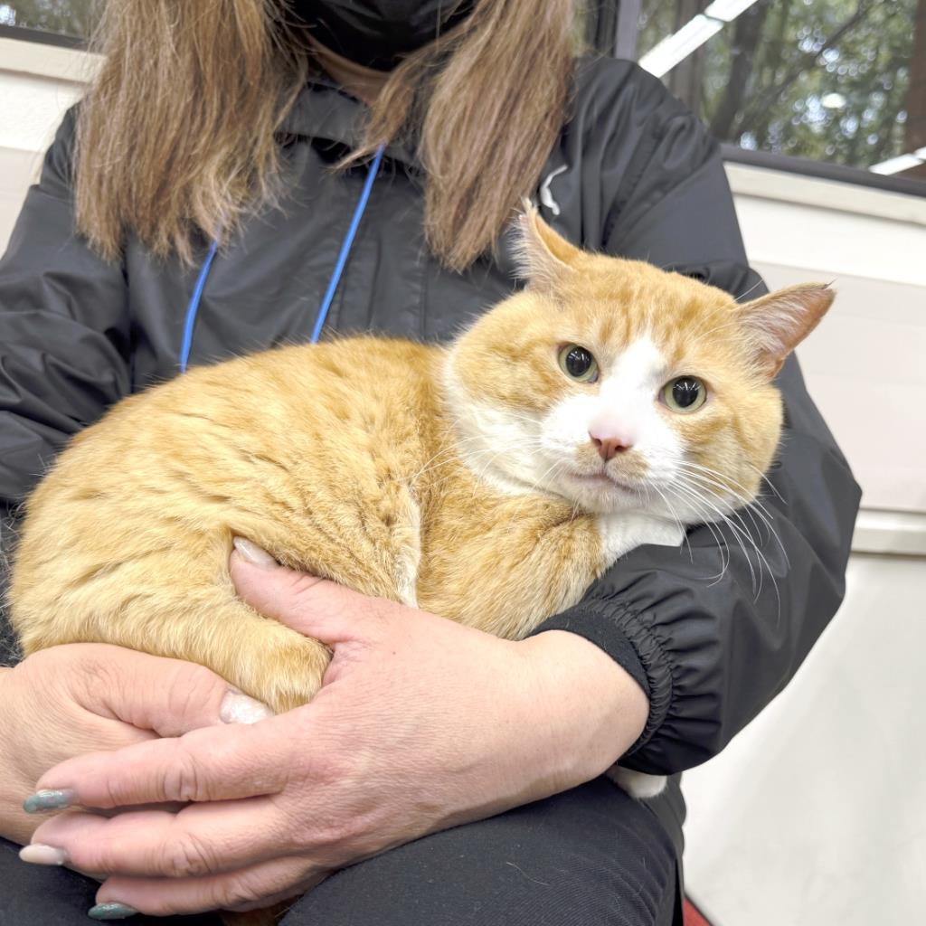 保護されているお家では、お子様からおばあ様まで、どんな世代の人間にもゴロゴロスリスリする甘えん坊さん。会場に来ると、緊張するのかあまり前に出ることなく、とても大人しくしています。焼きかつおのおやつが大好物! FIVキャリアですが、健康に全く問題なく、食欲も旺盛で元気に過ごしています。