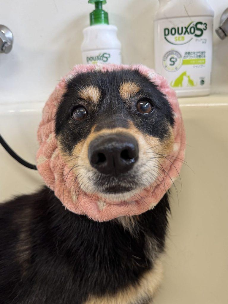 ドライヤーがちょっぴり怖いようですが、タオルで目隠ししてあげると大丈夫です!