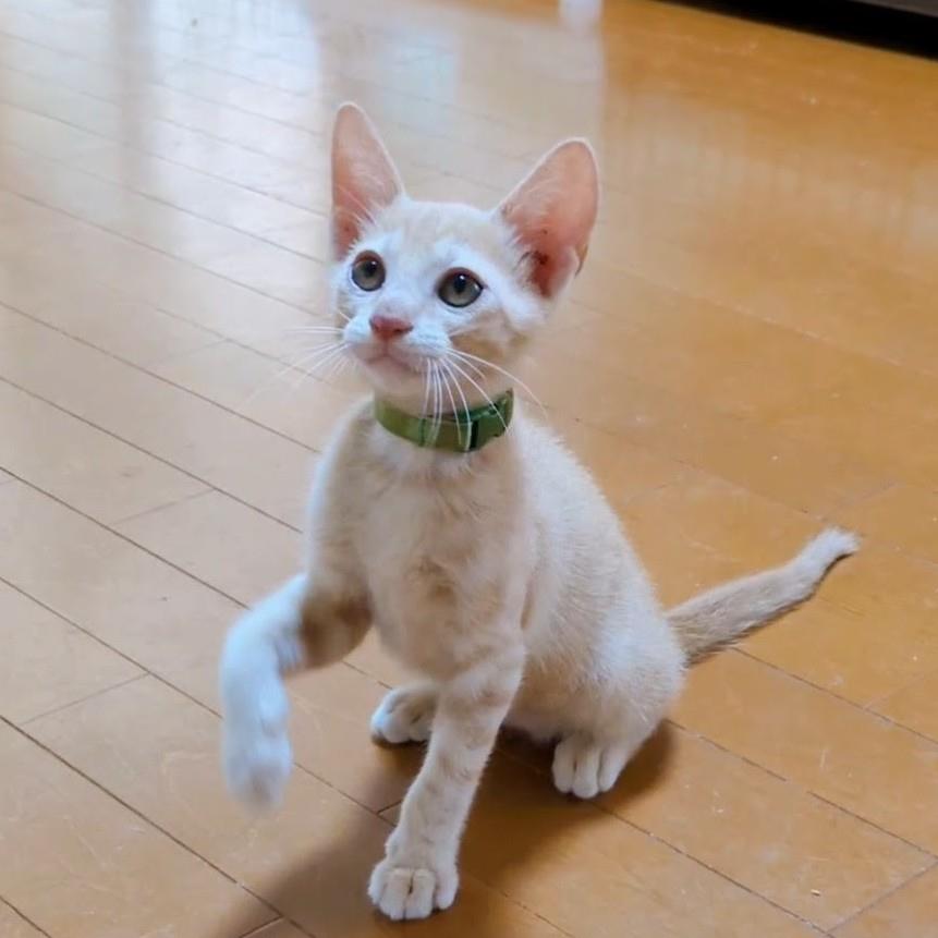 元気いっぱい活発な性格で、成猫にも臆せず向かっていきます。反面、知らない人や場所には少し怖がりな面も。お留守番が短い、または遊び相手をしてくれる先住猫がいるご家庭希望。