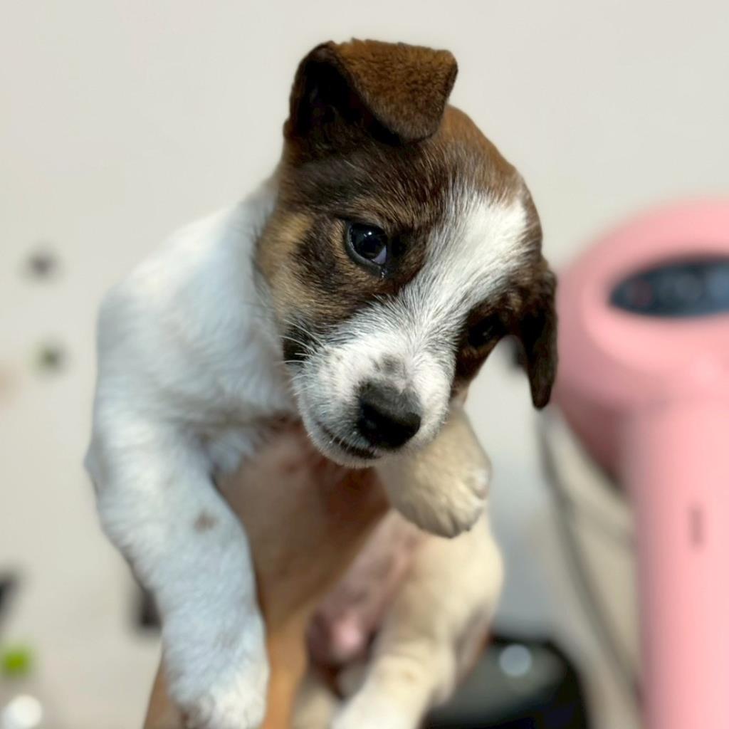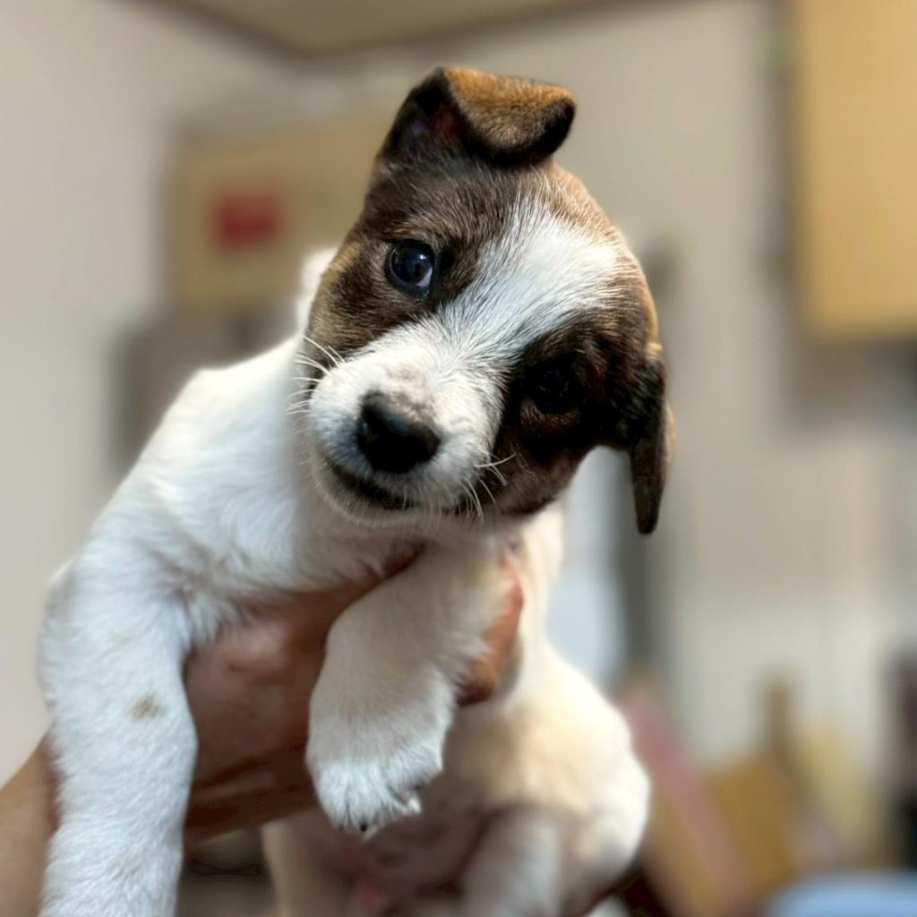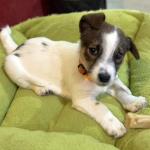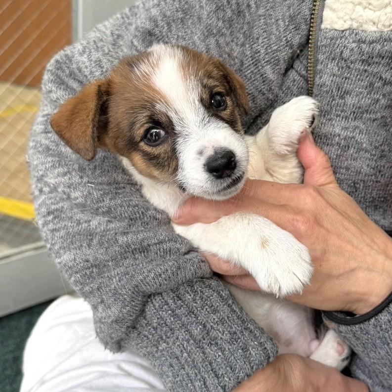 好奇心旺盛で何でもかじり、遊ぶのが大好きです。他の犬にもよくちょっかいを出します。留守番・食事・就寝時はケージで過ごします。斜頸があり水頭症は不明。左耳が小さく、左目は見えにくい様子です。