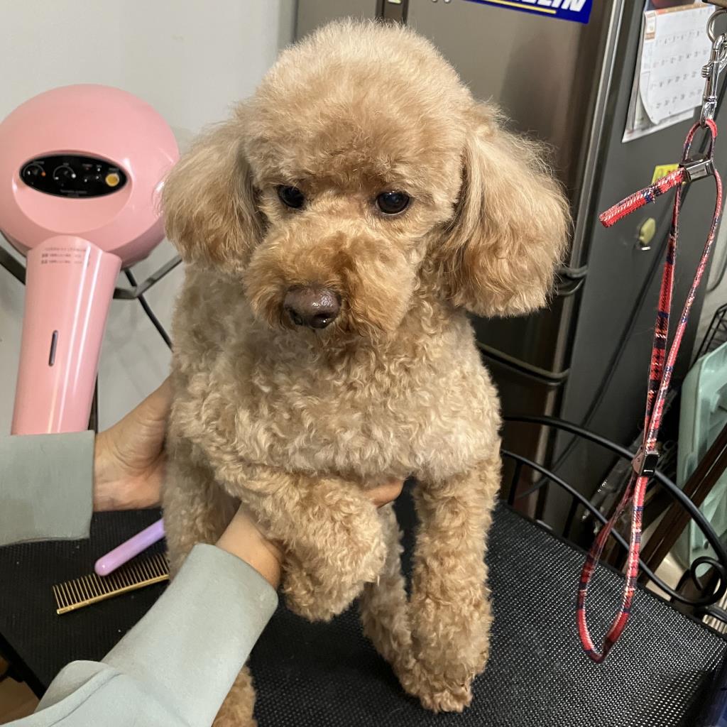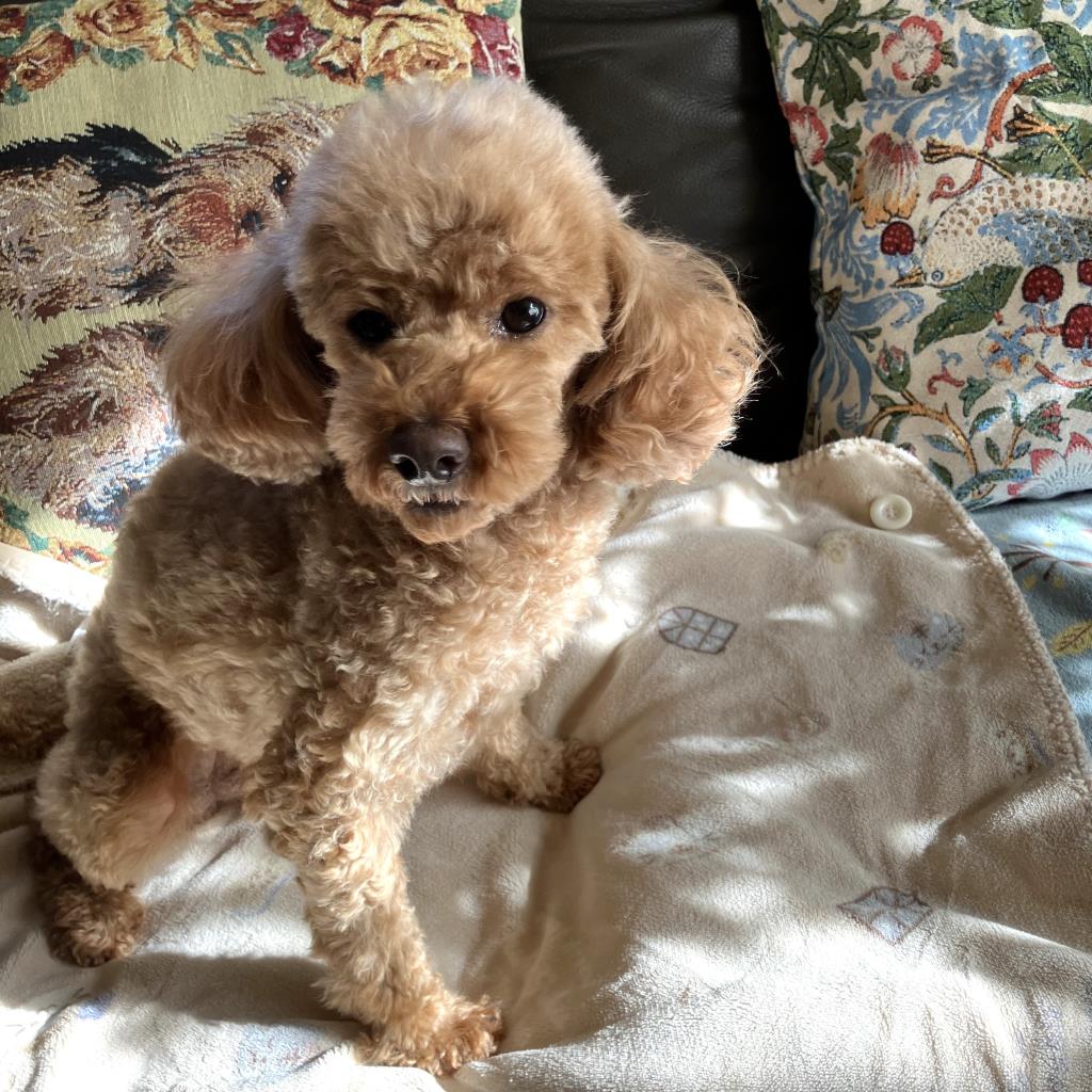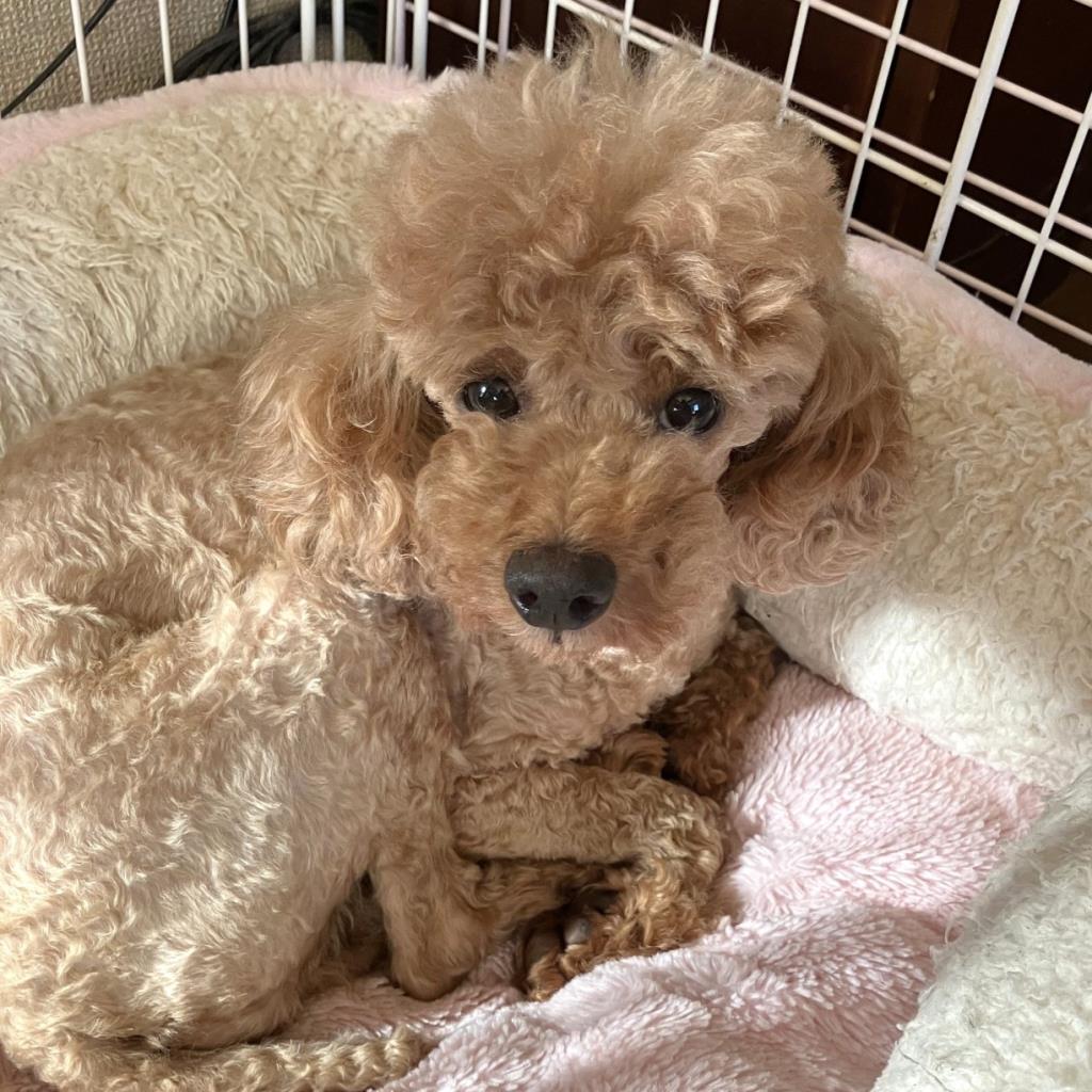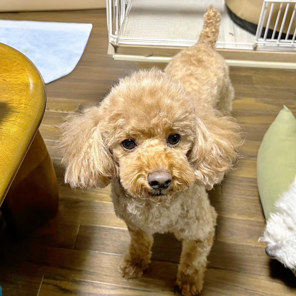 臆病ですが先住犬の真似をして後をつき、少しずつ甘え始めています。就寝と食事はケージ、在宅時はフリー。撫でて欲しい仕草も見せます。声帯切除のため将来気管疾患の可能性があります。