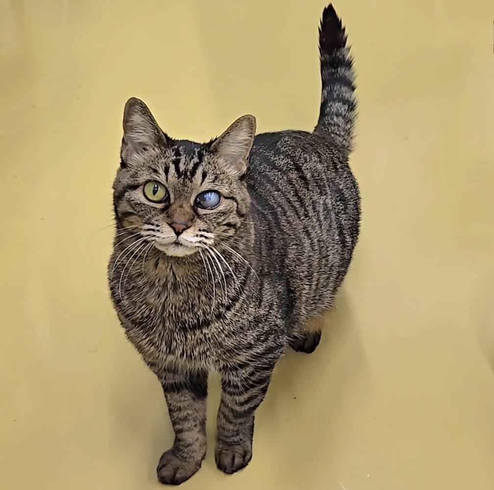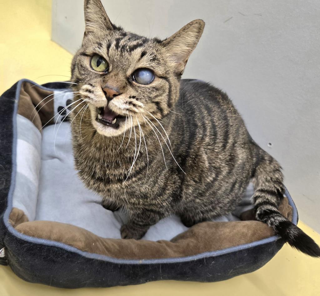 収容時から腎臓の数値が悪く、皮下点滴をしておりました。現在、数値は正常値まで落ち着いておりますが、高齢ということもあり、週1回皮下点滴を続けています。また、収容時から左眼が白濁しております。過去に生じた傷の名残りと思われ、痛みがあるものではなく、経過観察をしております。