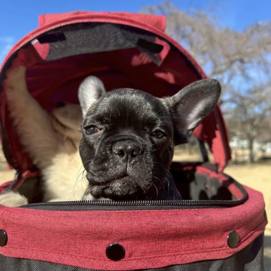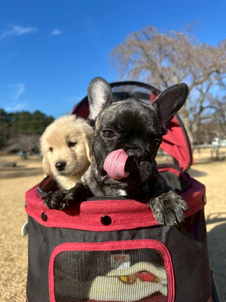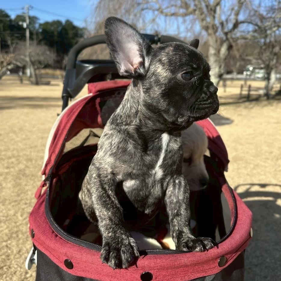 子犬のためなんでも興味津々で、フレブルらしい運動量もあり、他の子たちとも仲良く遊びます。