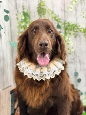 閉鎖的な環境で育ったにも関わらず、性格はフラットらしさが全面にでており、人が大大大好きです。老若男女ウェルカム状態で尻尾をフリフリで近づき撫でてもらったり構ってもらうのが大好物な子でいつもニコニコ笑っています。人が動けば付き纏ってくるタイプで動きが派手なかまって女子です。