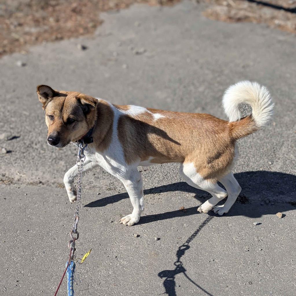茶と白のツートンカラーで、やや黒いマズルが引き締まった印象の女の子です。