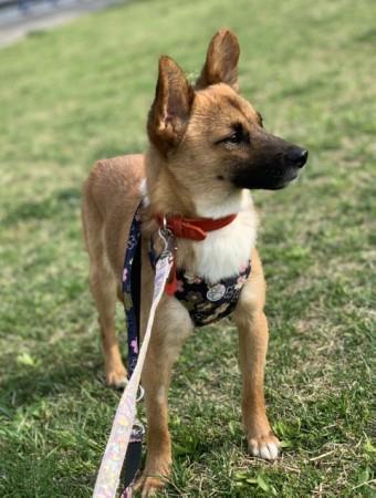 散歩は大好きです。ハーネスを見せると自分から頭を入れてきます。気になるものが多くて寄り道したがりますが強く引くことはありません。