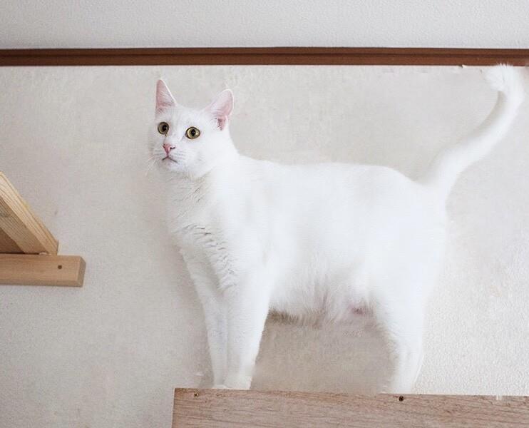 性格は明るく、人も猫も怖がらず、いつもご機嫌に尻尾を立てて歩きます。