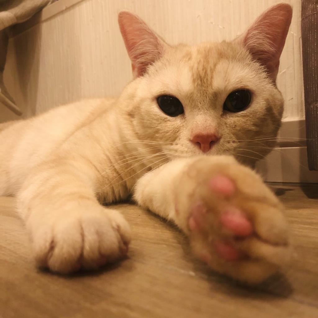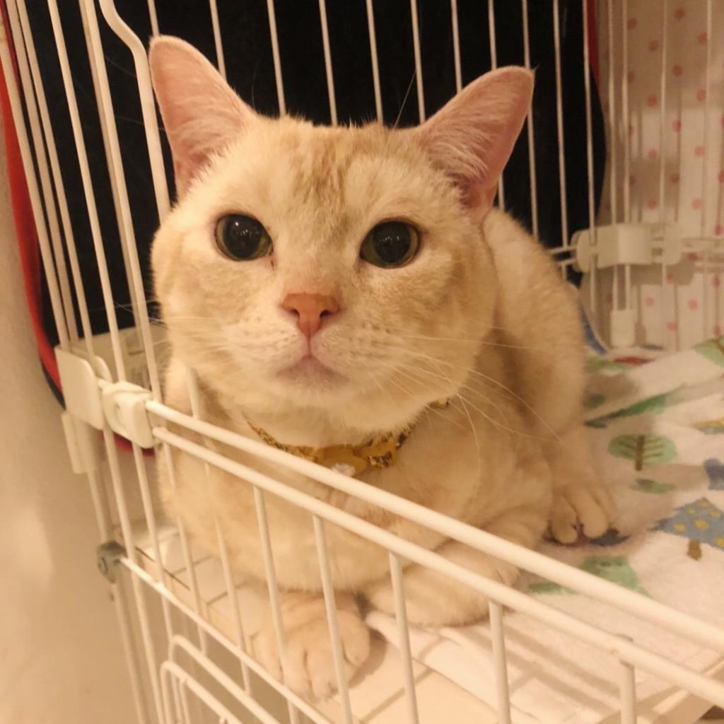 日常の様子:臆病で人や犬の気配を感じて箱の中に丸くなっていますが、少しずつ環境にも慣れて目線を離せばご飯を食べたり水を飲んだりしています。近づくと箱の中に逃げてしまいます。お水は前足を水ボールに入れて舐める様に飲みます。その時に溢した水は舐めて飲みます。威嚇、噛みつく、引っ掻く等はありません。