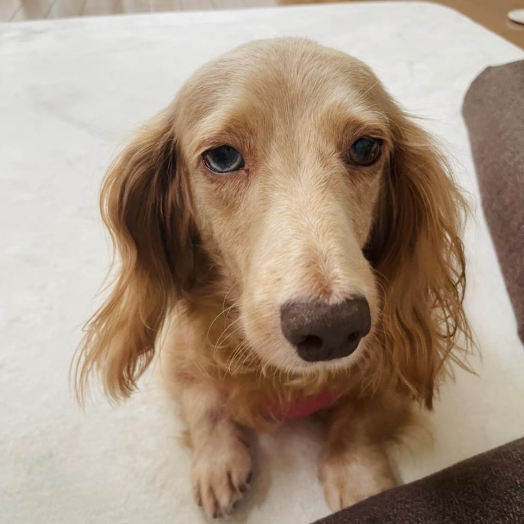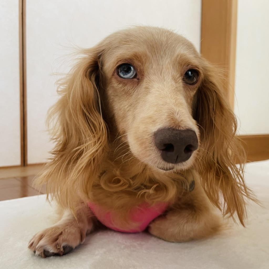 日常の様子:フリーにしていてもケージの中からこちらの様子を覗いています。触ると嬉しそうにして、ケージから出てきてくれます。太っていて家の中ではゆっくり歩いています。掃除機や大きい物音に驚いたときは少しだけ走ります。ケージが苦手ではないので、吠えずに静かにお留守番もできます。