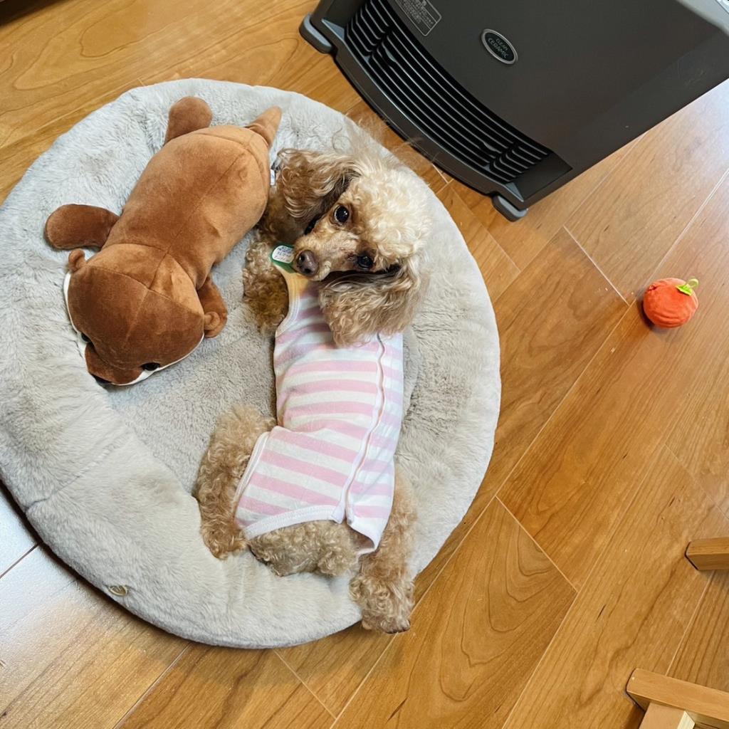 日常の様子 : フリーにしているとずっと歩き回っています。立ち止まってもお座りすることはなく立ち尽くしています。日中、仕事中は大人しく寝ています。離れない安心感を必要としている様子。