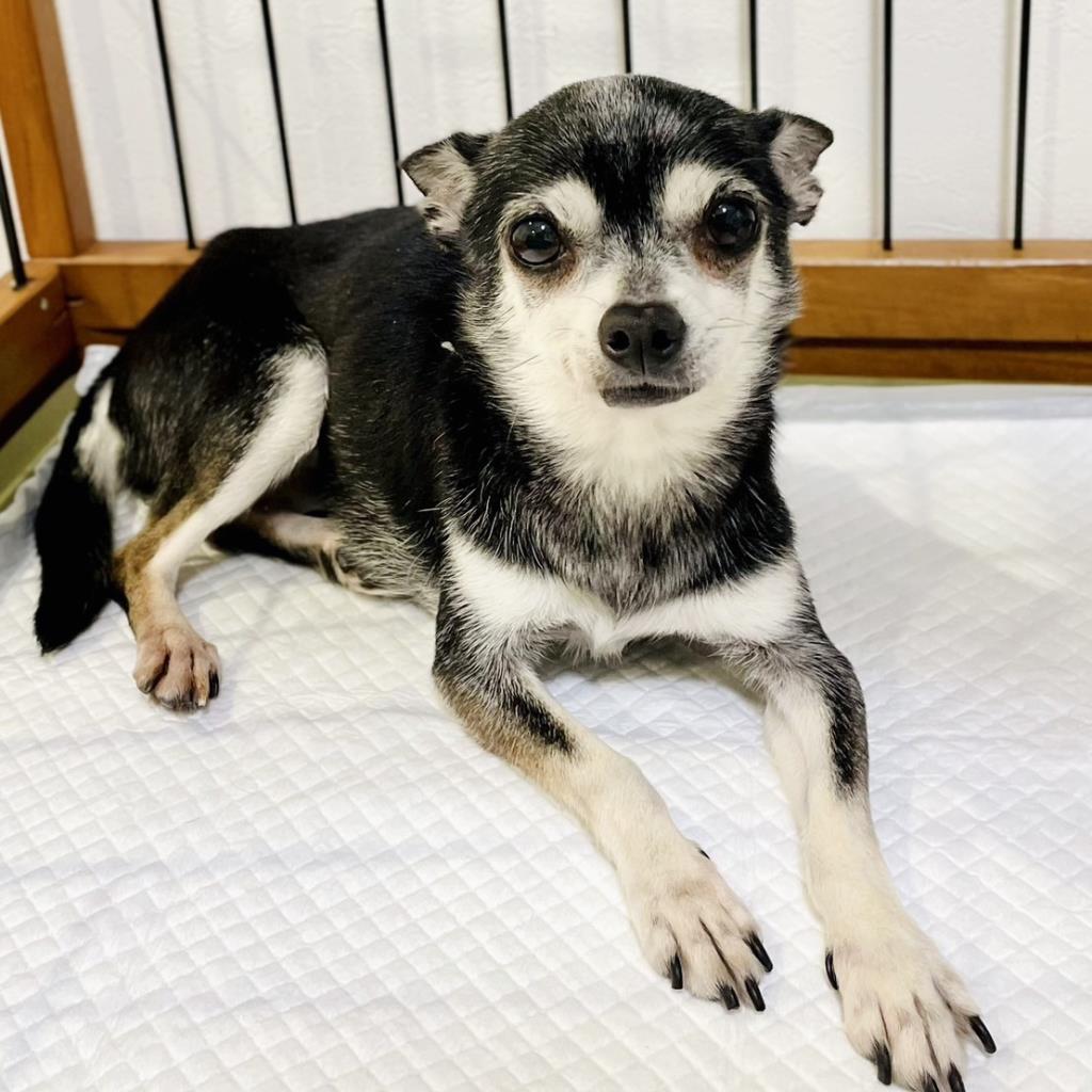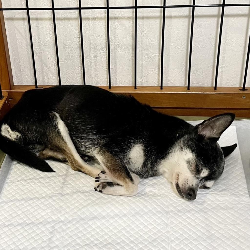 日常の様子:食欲旺盛。先住犬のベッドやクレートに入り、寝心地を色々確認した後、お気に入りのベッドを決めて寝ています。パリパリとプラスチック袋の音が聞こえると出てきて食べ物を欲しがります。その後またすぐベッドに戻って寝ます。
