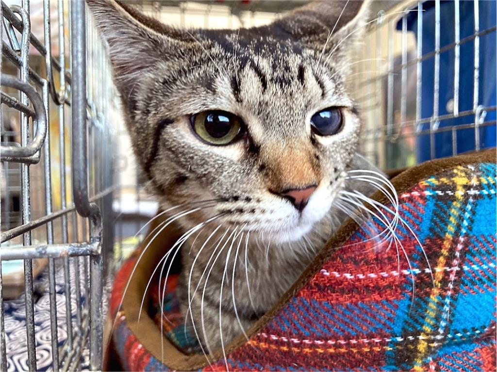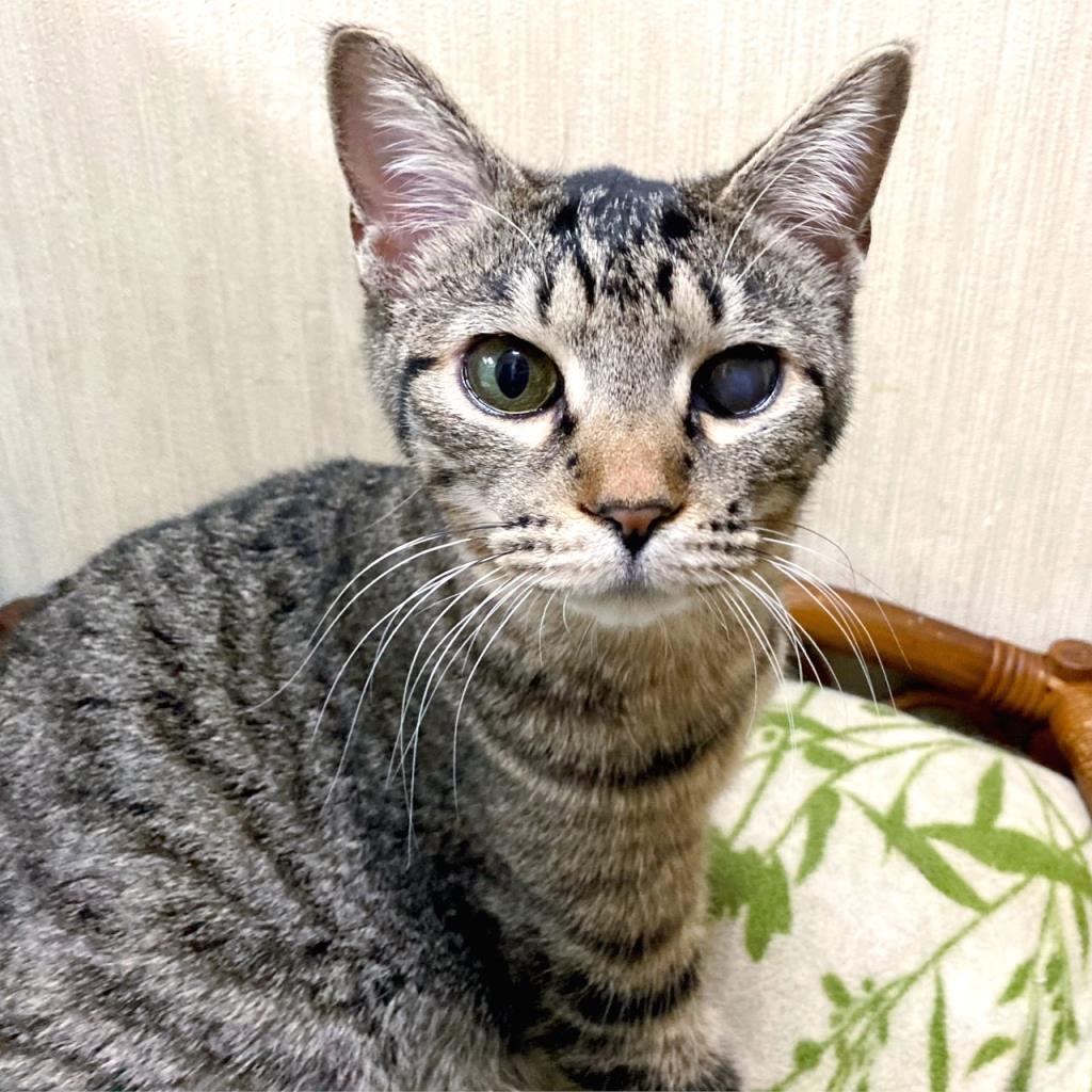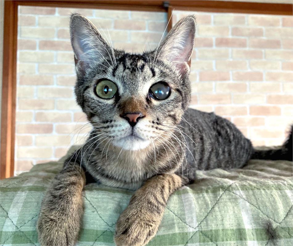 外暮らしをしているときの酷い猫風邪の後遺症で左目は少し濁りが残りましたが、視力や普段の生活に全く影響はありません。食欲がものすごく、他の猫のご飯を「ちょーだい!」と食べたがるほどです。