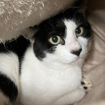 とある方のお家にごはんをもらいに来るようになり、保護されました。現在は人見知りキャンペーン絶賛開催中ですが、とても美形のハチワレくんです。なぜかいつもベッドを上下逆にして潜っています。ちゃんと『ここにいるよ』アピールしないと、ごはんもらいそびれるよ😅早くラッキーの仲間に慣れてね☺️