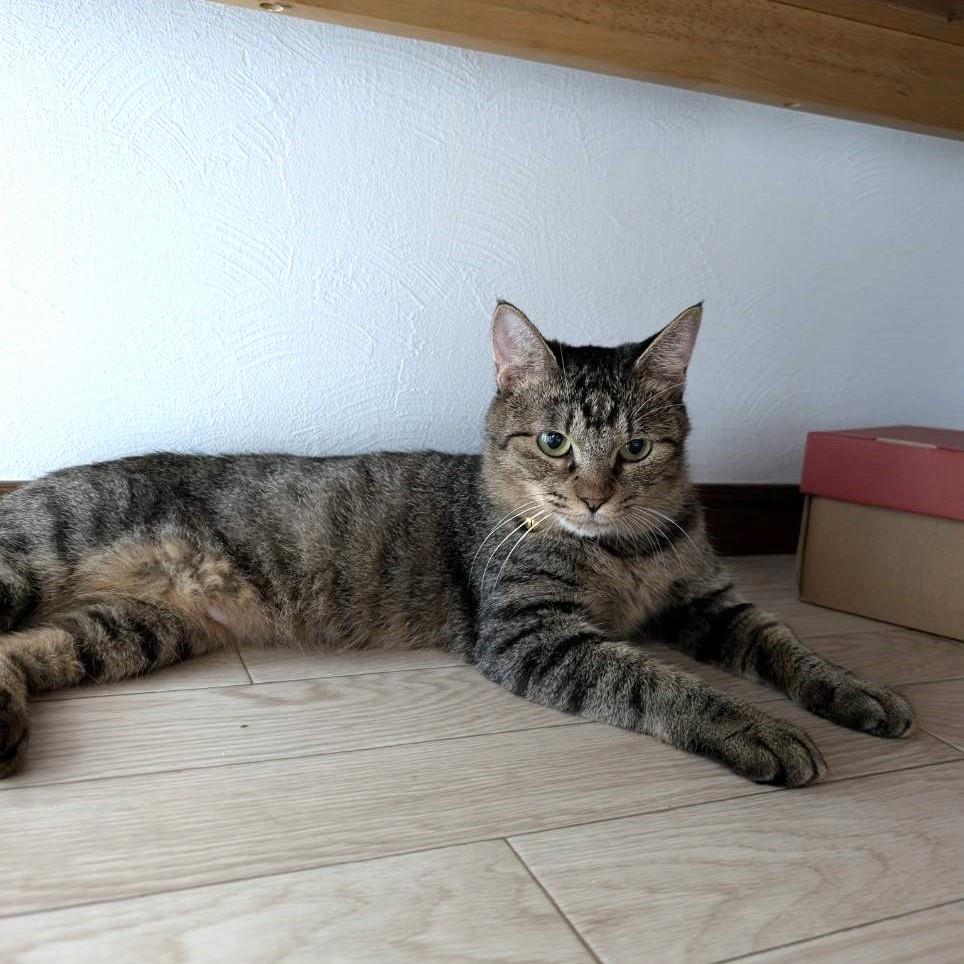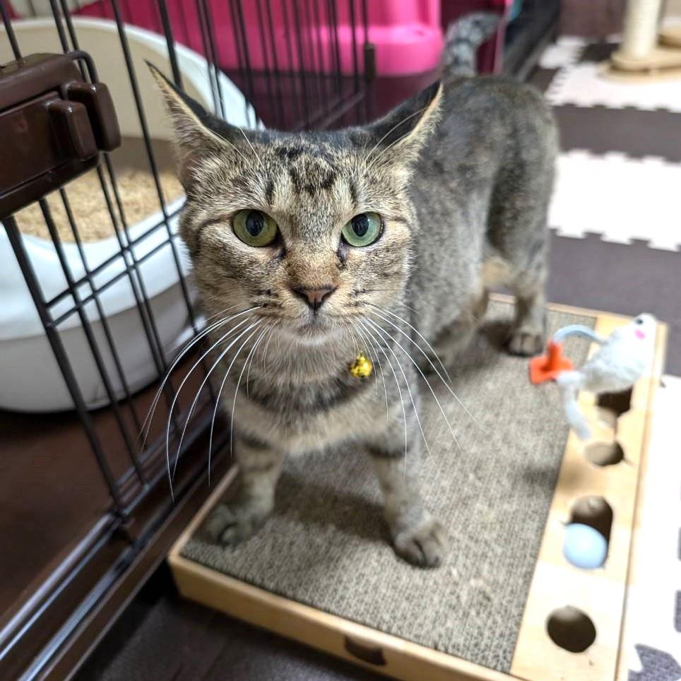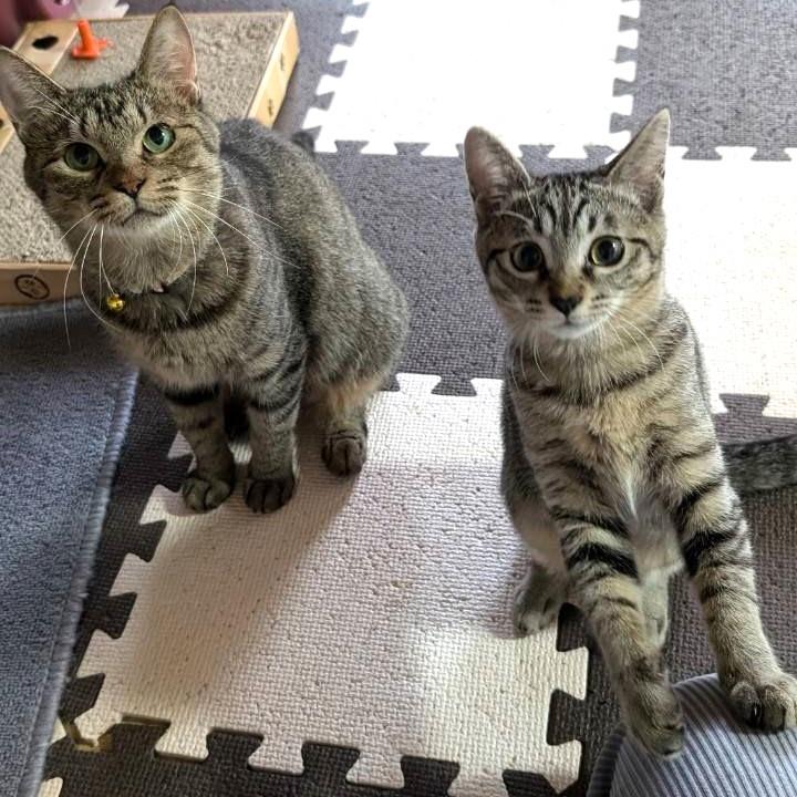日常の様子:とても人懐っこく呼ぶと来てくれて、スリスリしてきます。子猫のこんぶちゃんとニャンプロしたり猫じゃらしでも遊びます。