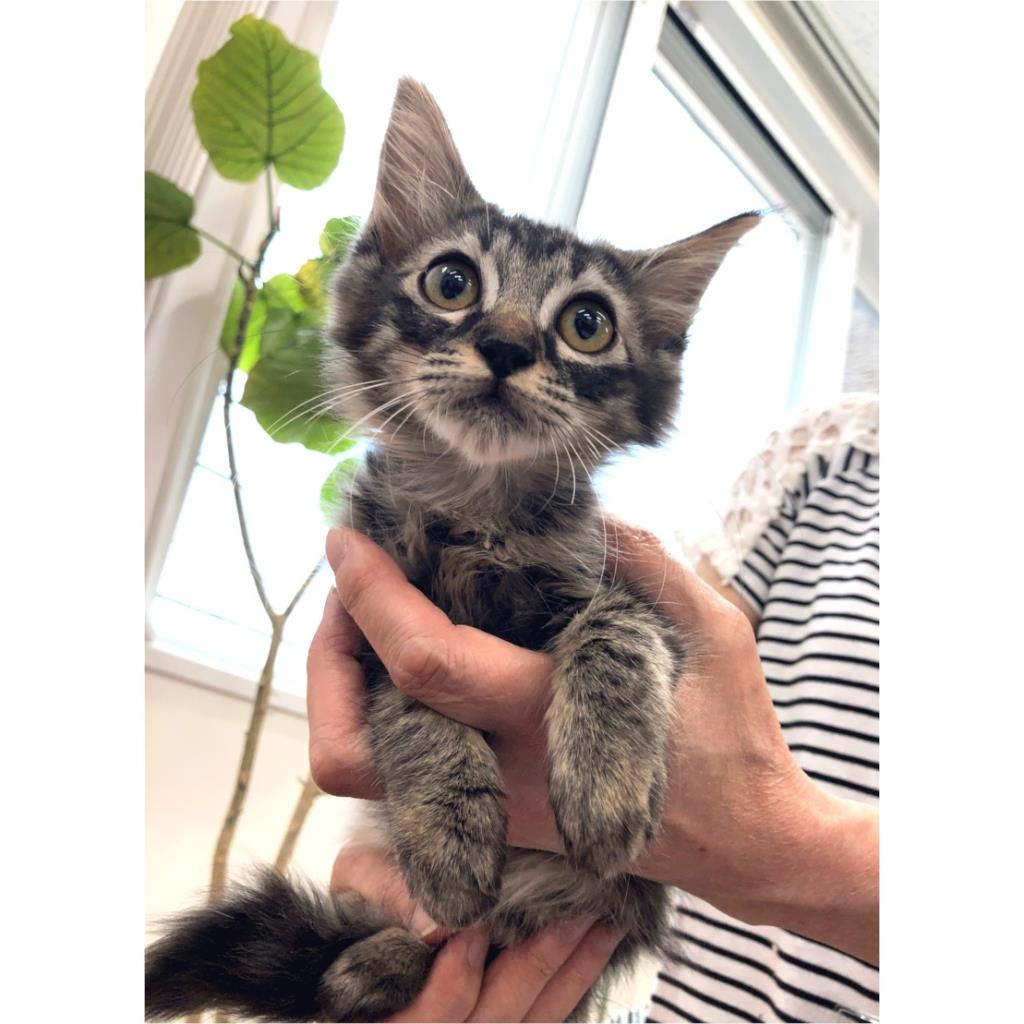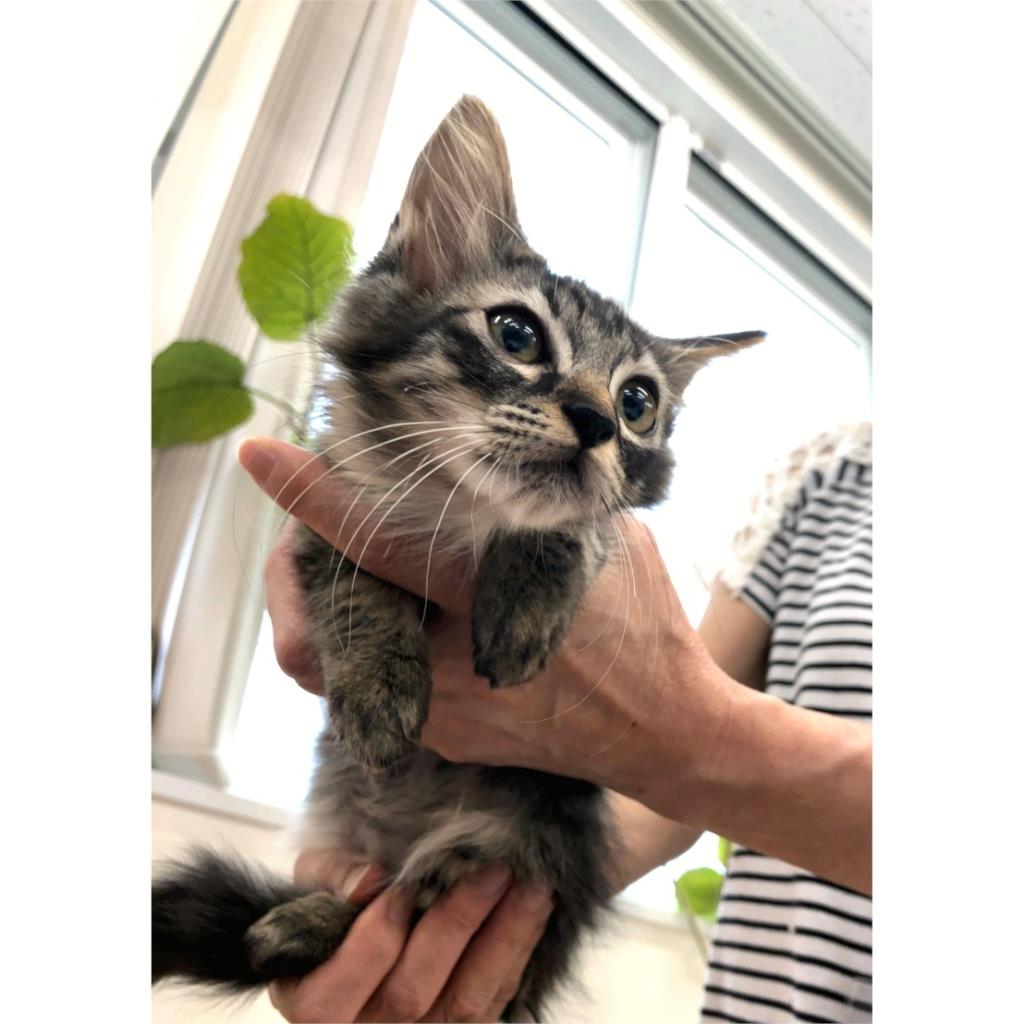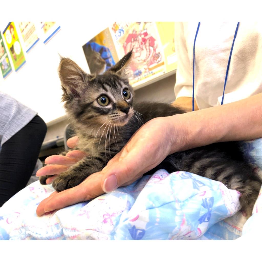 保護した時の治療で、目薬の滴下にも慣れてくれました。怖がりですが抱っこすること直ぐにゴロゴロ喉を鳴らします。ウエットフードが好みのようですがドライフードもきちんと食べることはできます。姉妹の中では小柄ですが、鳴いて人を呼んだりと思ったことははっきり伝えてくるタイプです。