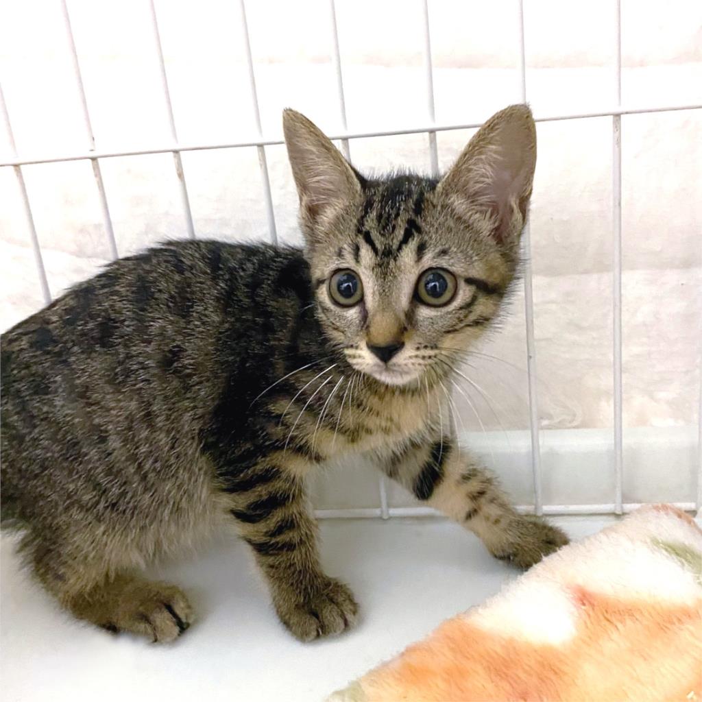 ちょっぴり怖がりさんで時々シャーが出ちゃいますが、攻撃性はありません。「こわいよーたすけてー」のサインなのです。大きな目でじーっと見つめてくる姿が愛らしいです。猫のことが大好きな子猫。「円(まどか)」と姉妹です。