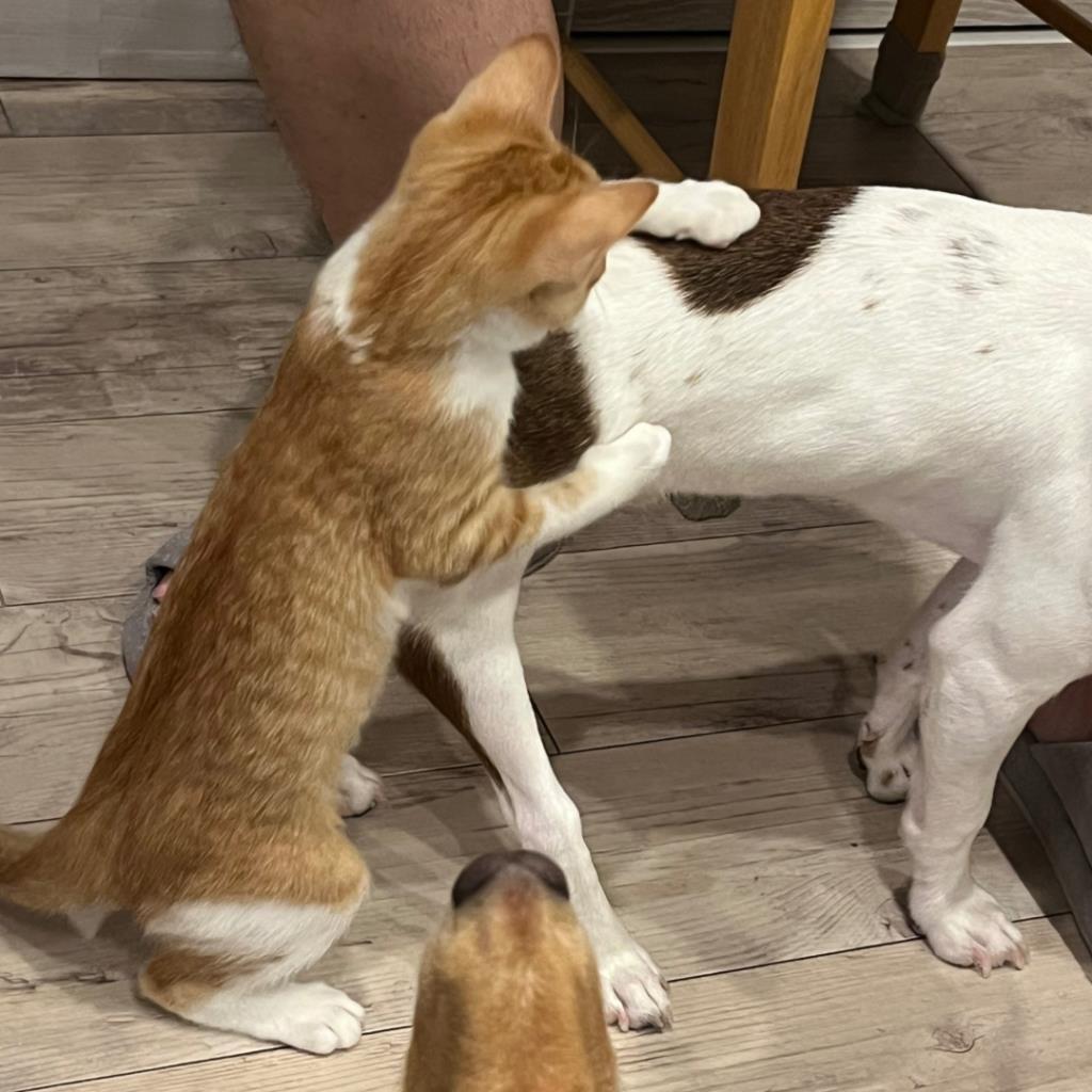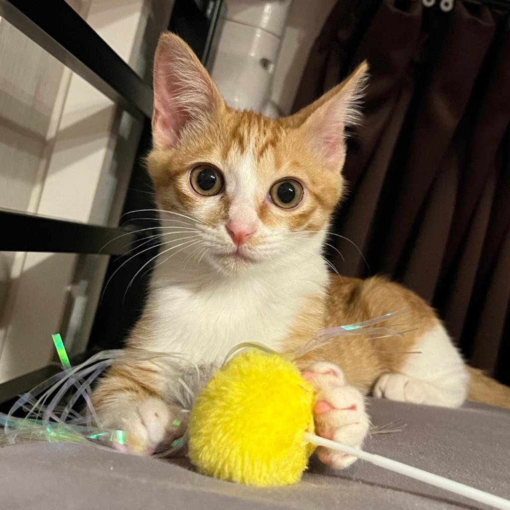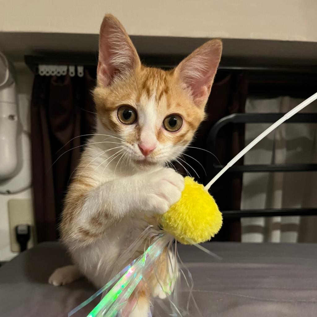 朝起きた瞬間から家の中を稲妻のように走り抜け、ボールを転がすと全力で追いかけて遊び、ねこじゃらしを見つけるとびっくりするほどのハイジャンプ!とにかく元気いっぱいな女の子です。犬とも仲良く遊べます。抱っこでまったりすることも好きでゴロゴロかわいい声で鳴いて催促してくれますが、からだ全身を使っておもちゃで遊ぶ方が好きなようです。