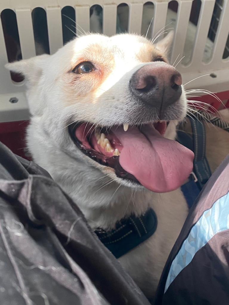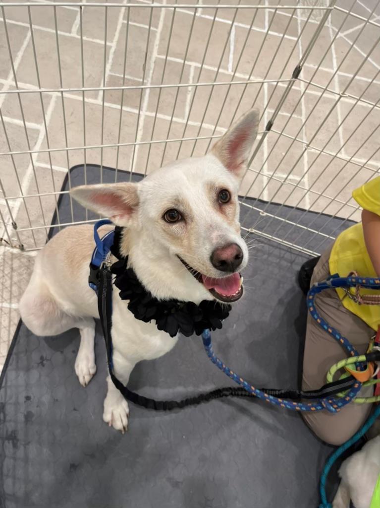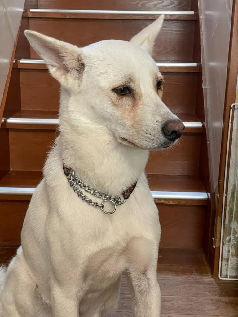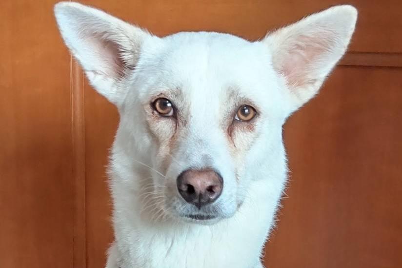 脚が長くとてもスタイルの良い真っ白なコです。穏やかでのんびりタイプです。繊細なところもあり、お散歩中知らない人などを怖がることもあります。マイペースなところがあって自分が歩きたい方向へ引っ張ることもあります。力があるコなのでお散歩中にしっかりとリードすることが必要です。お散歩に行きたい時、要求があるときに心ちゃん語で訴えてきます。