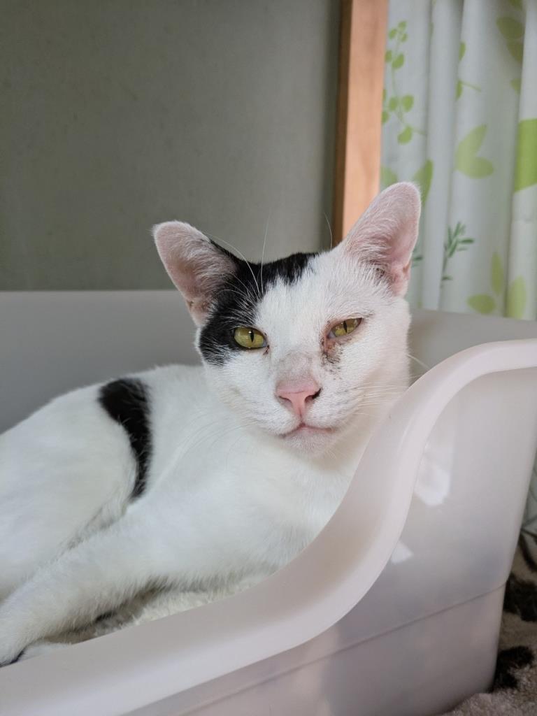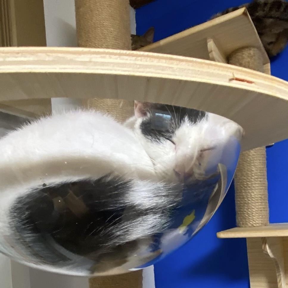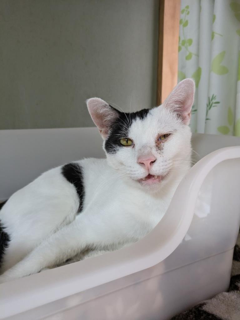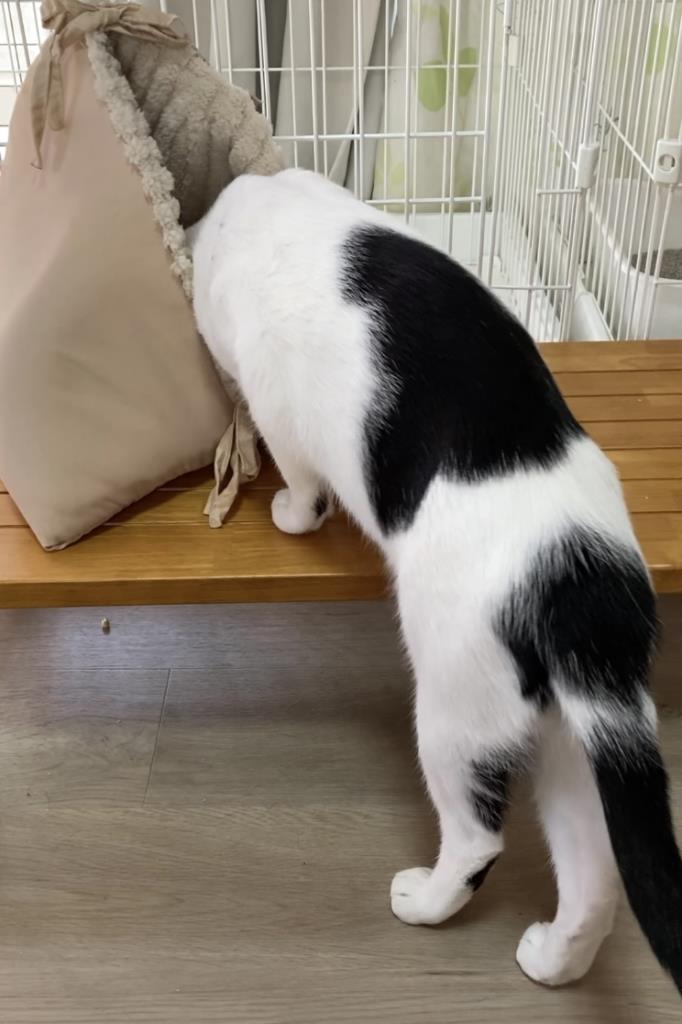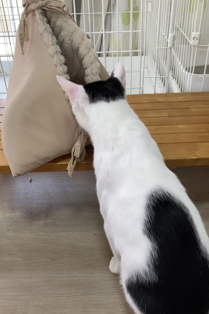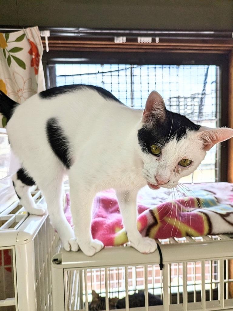 馴れた環境では誰彼かまわずスリスリアピールが止まらないのに、シェルター以外の場所になると“借りてきた猫”になってしまい持ち前のフレンドリーさがアピールできずにいます。超絶甘えんぼうで、ほかの猫にかまっていると横入りしてくる“ナデナデ泥棒”です。譲渡会が大の苦手で、マットにすっぽり隠れてしまい“会えそうで会えないアイドル”と化すので、ぜひシェルターで触れあっていただきたいです。さみしさでウールサックしないように、たくさんのコミュニケーションと、目がショボショボして涙やけになりやすいので、こまめな観察&ケアをお願いします。